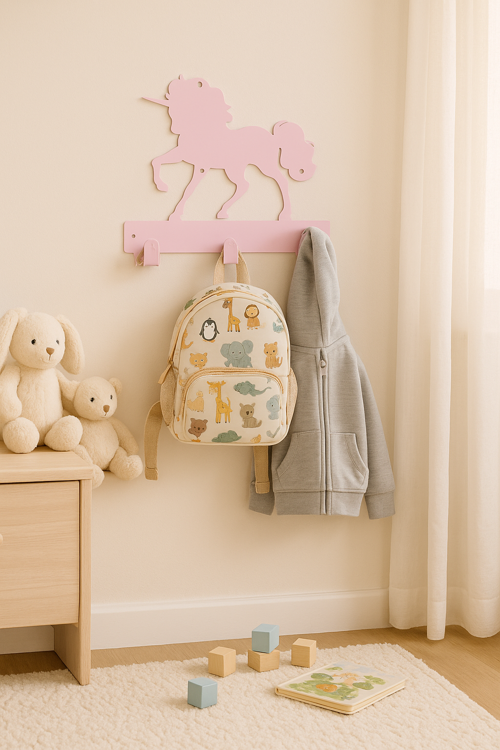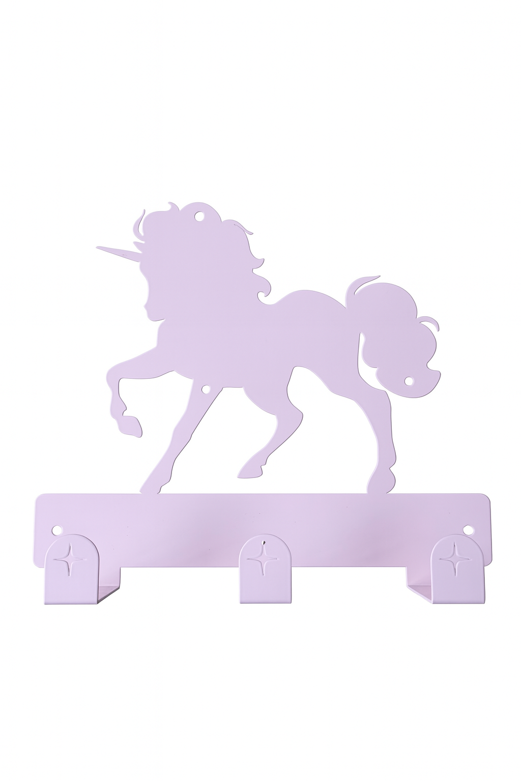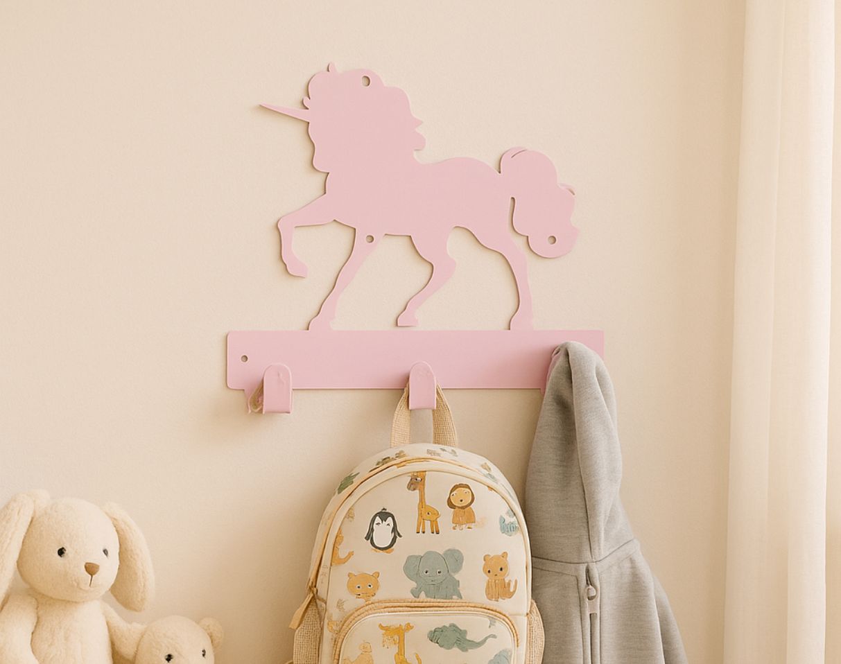 Este encantador perchero con silueta de unicornio es ideal para decorar habitaciones infantiles.