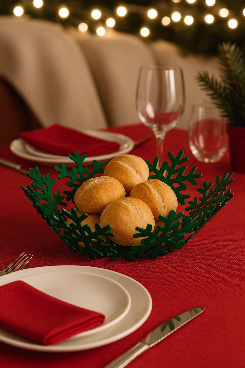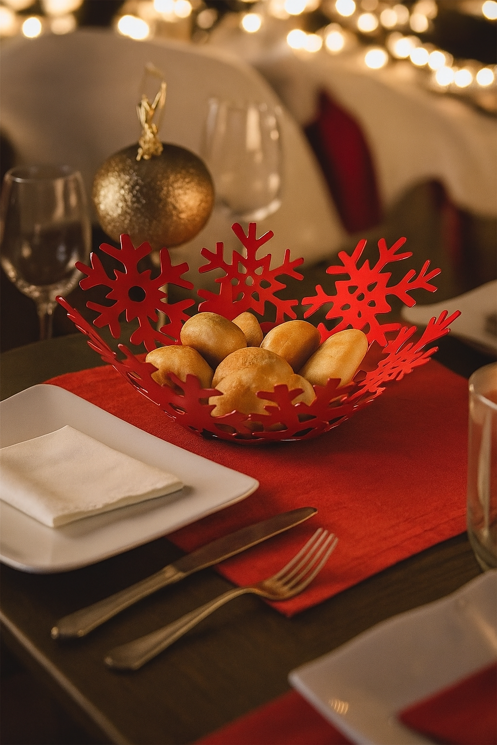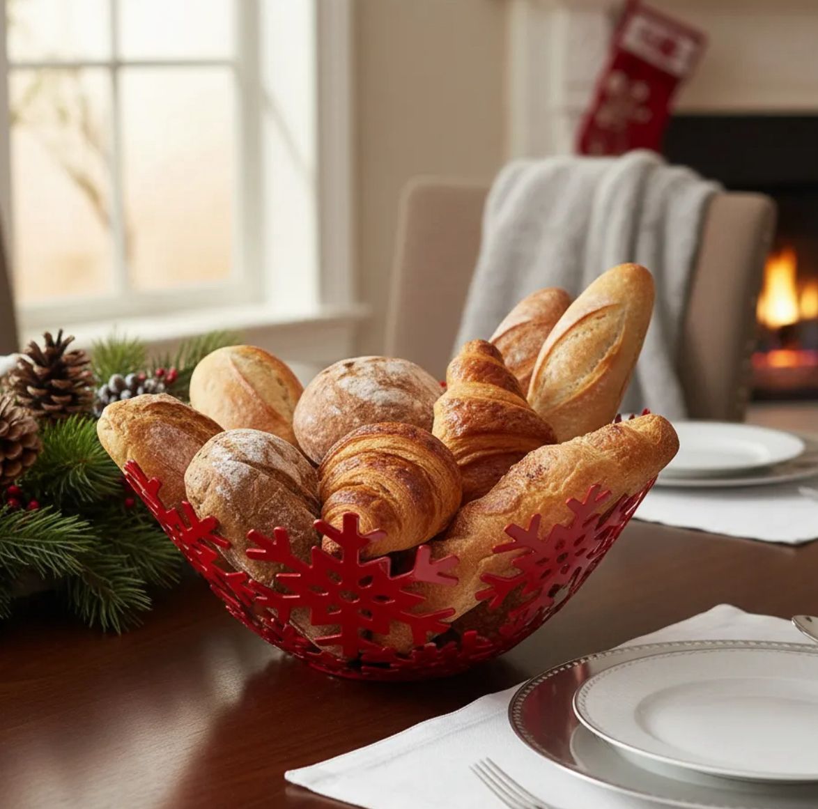 Centro de mesa o panera navideña con diseño de copos de nieve, ideal para decorar y servir pan, frutas o dulces durante las fiestas.