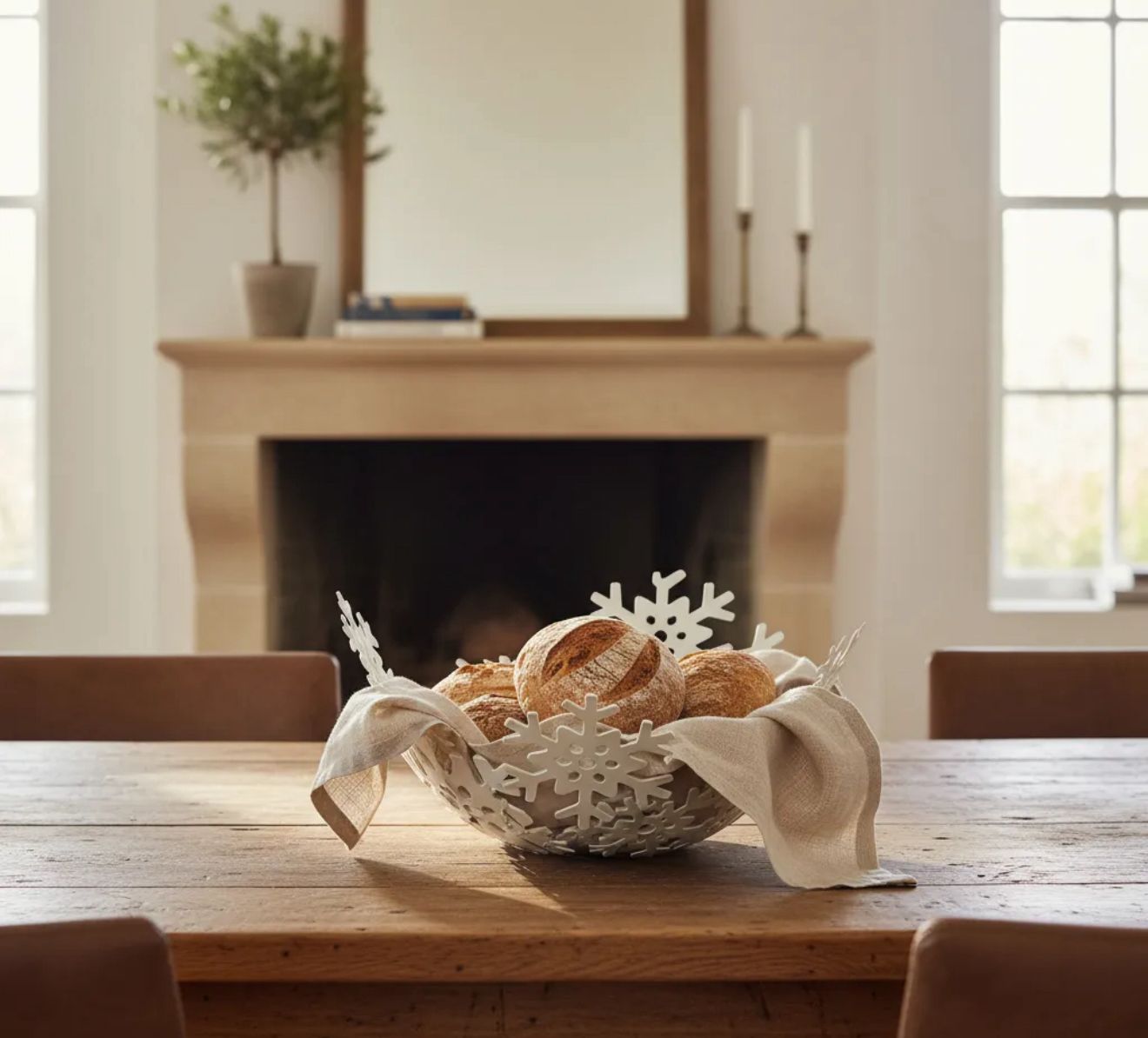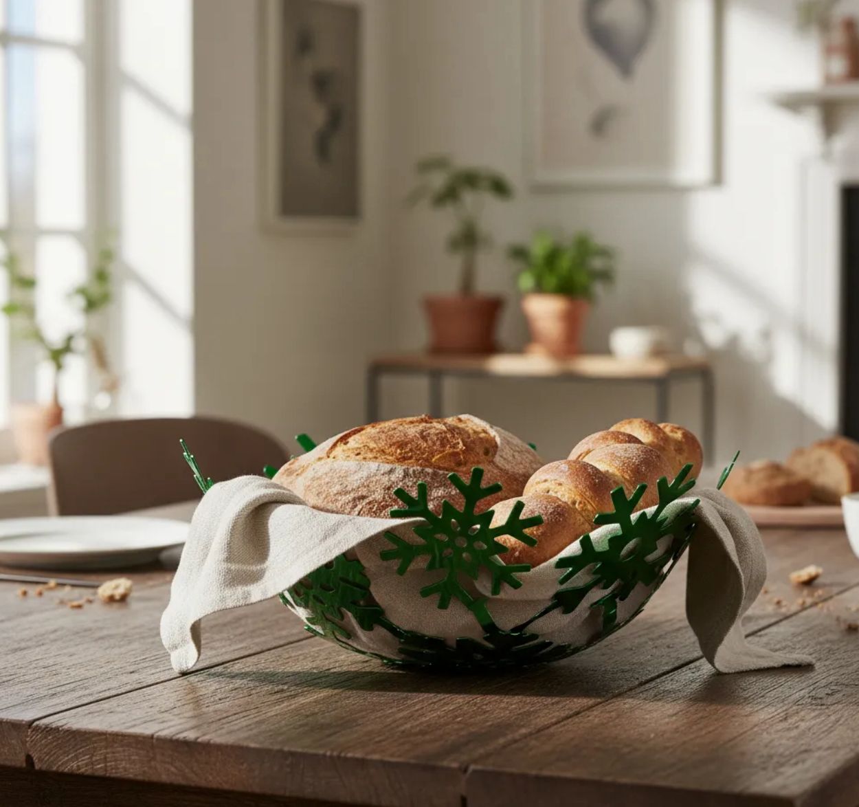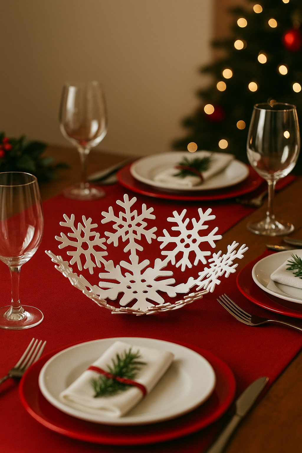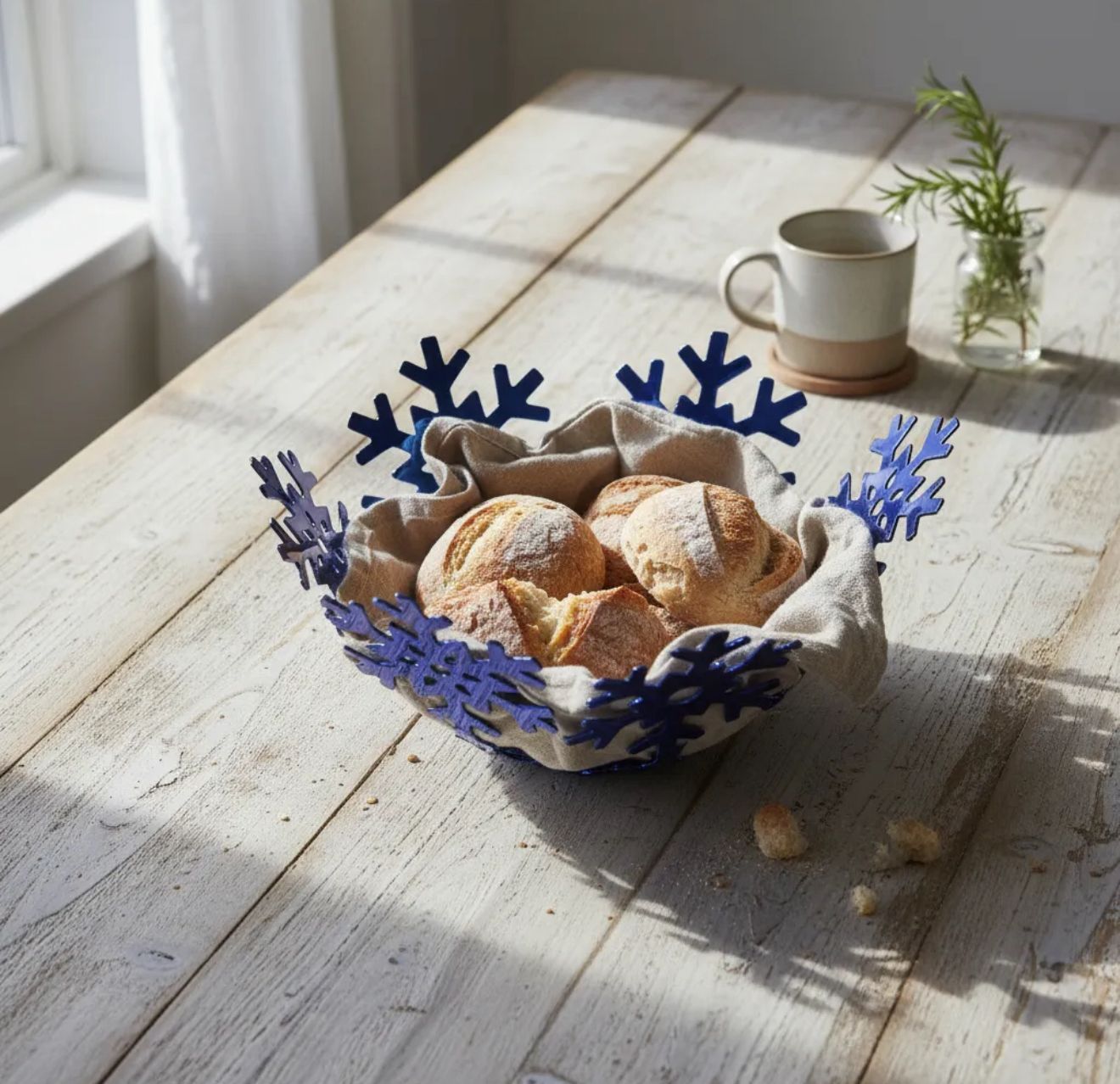 Centro de mesa o panera navideña con diseño de copos de nieve, ideal para decorar y servir pan, frutas o dulces durante las fiestas.