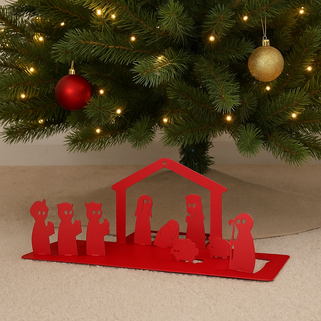 Pesebre navideño realizado en acero pintado al horno, con un diseño moderno y minimalista que reinterpreta la clásica escena del nacimiento. Ideal para decorar tu hogar en las fiestas con un toque elegante y contemporáneo.