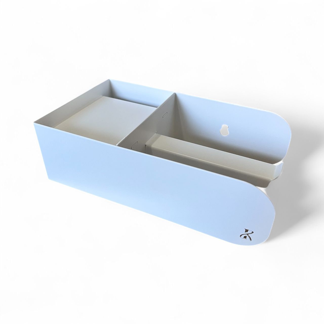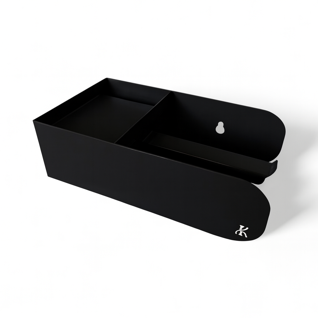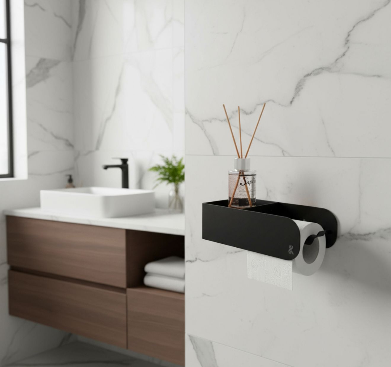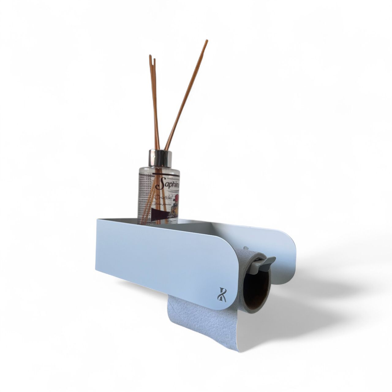 Diseño redondo en acero pintado al horno con repisa superior para apoyar objetos. Funcional, resistente y moderno.
