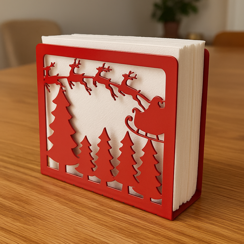 Servilletero navideño fabricado en acero pintado al horno, con diseño calado de trineo y pinos. Ideal para decorar la mesa en las fiestas con un toque elegante y moderno.