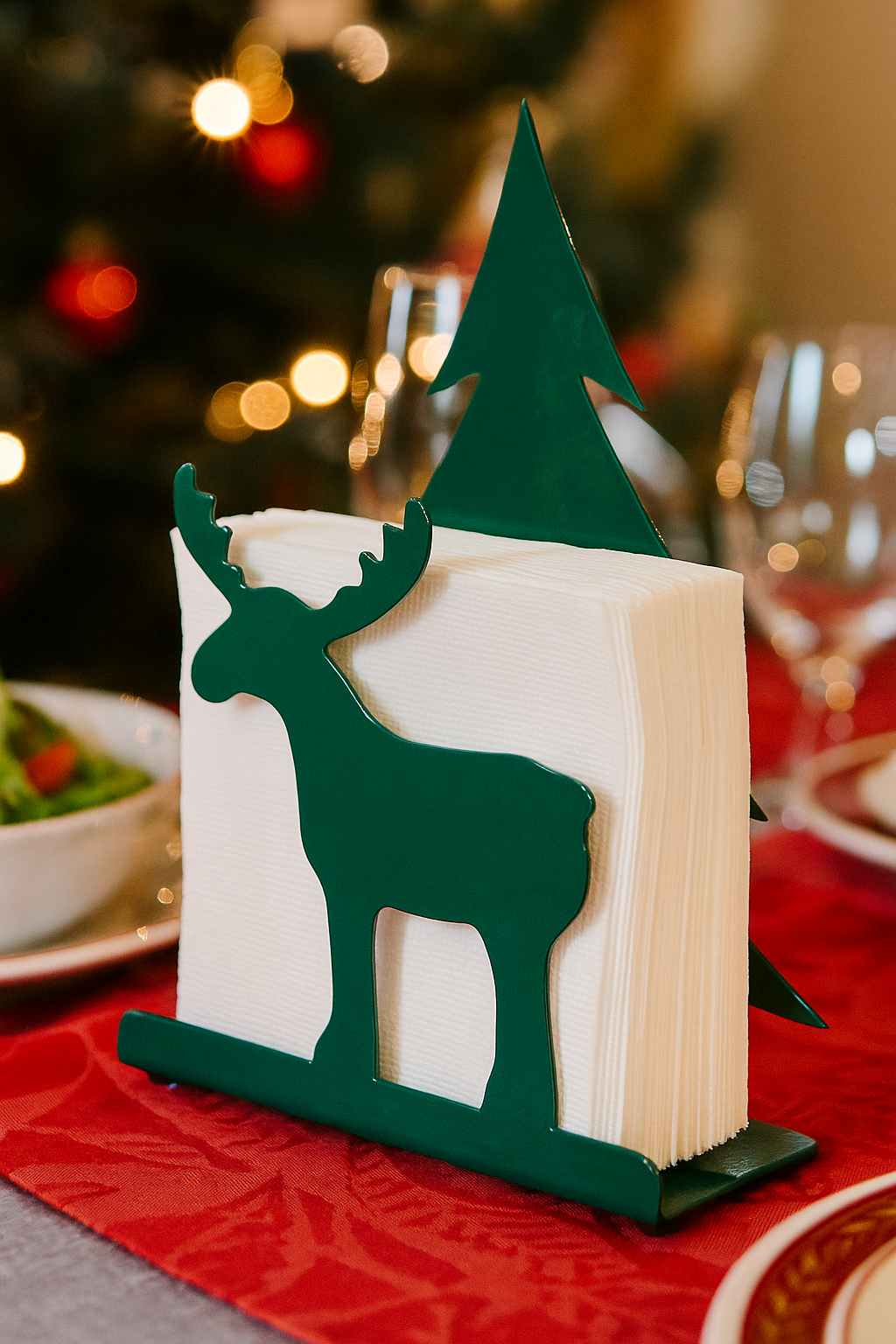 Servilletero navideño de acero con diseño de reno y pino, ideal para decorar tu mesa en las fiestas.